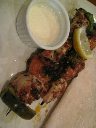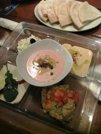 前菜:Pita薄餅沾五種醬料 (pita非常的Q且有嚼勁,配上沾料有酸、有甜、有辛辣香,非常好吃,與Mell我以前在國外吃的口味一模一樣,非常道地! )
